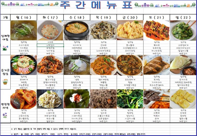 2026년03월16일~2026년03월22일 주간식단표