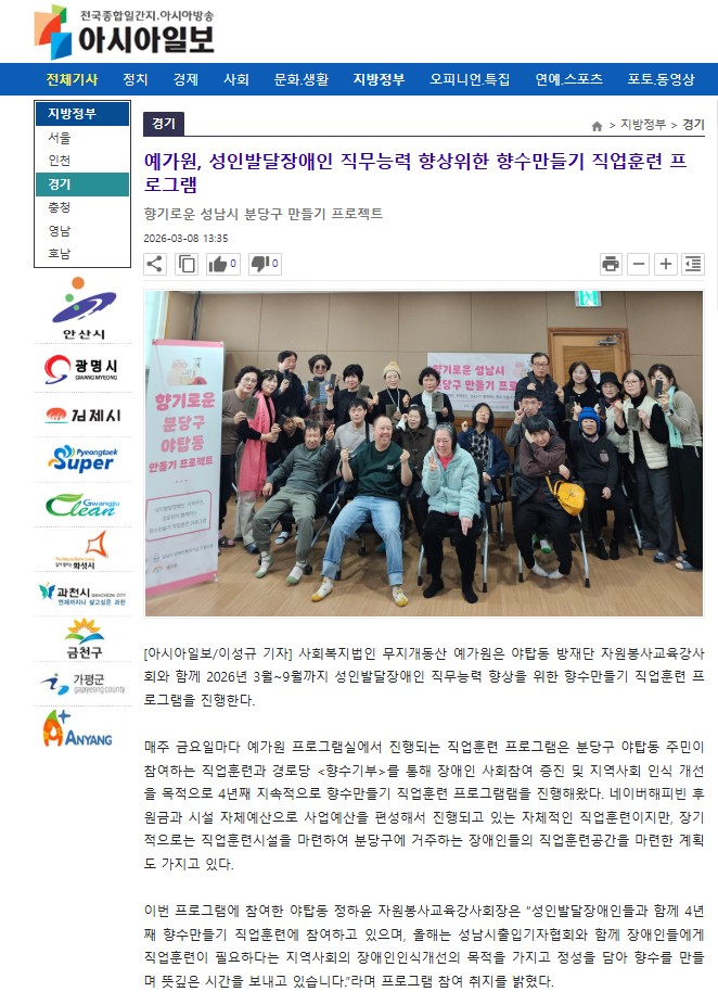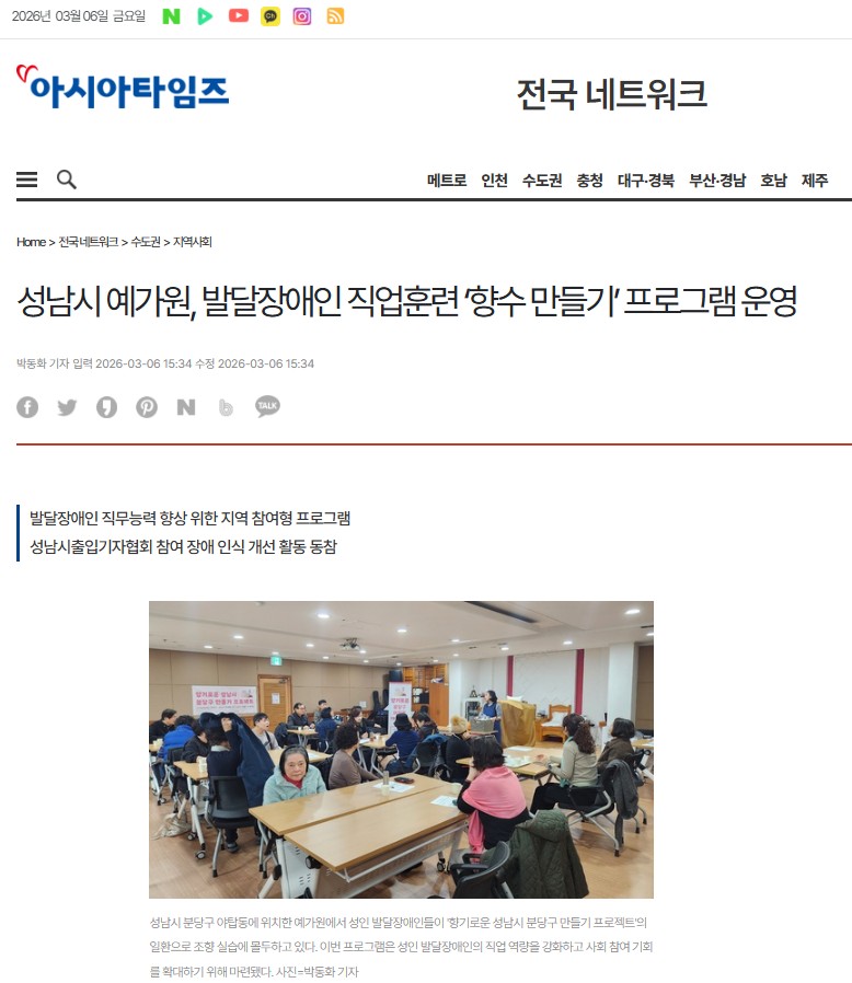 2026년에 진행되는 <야탑동 주민이 참여하는 향수만들기 직업훈련 프로그램>과 관련된 기사와 보도자료가 아시아타임즈, 아시아일보 등 다양한 언론 홈페이지에 기사회되면서 사업을 홍보하는 성과가 있었습니다.